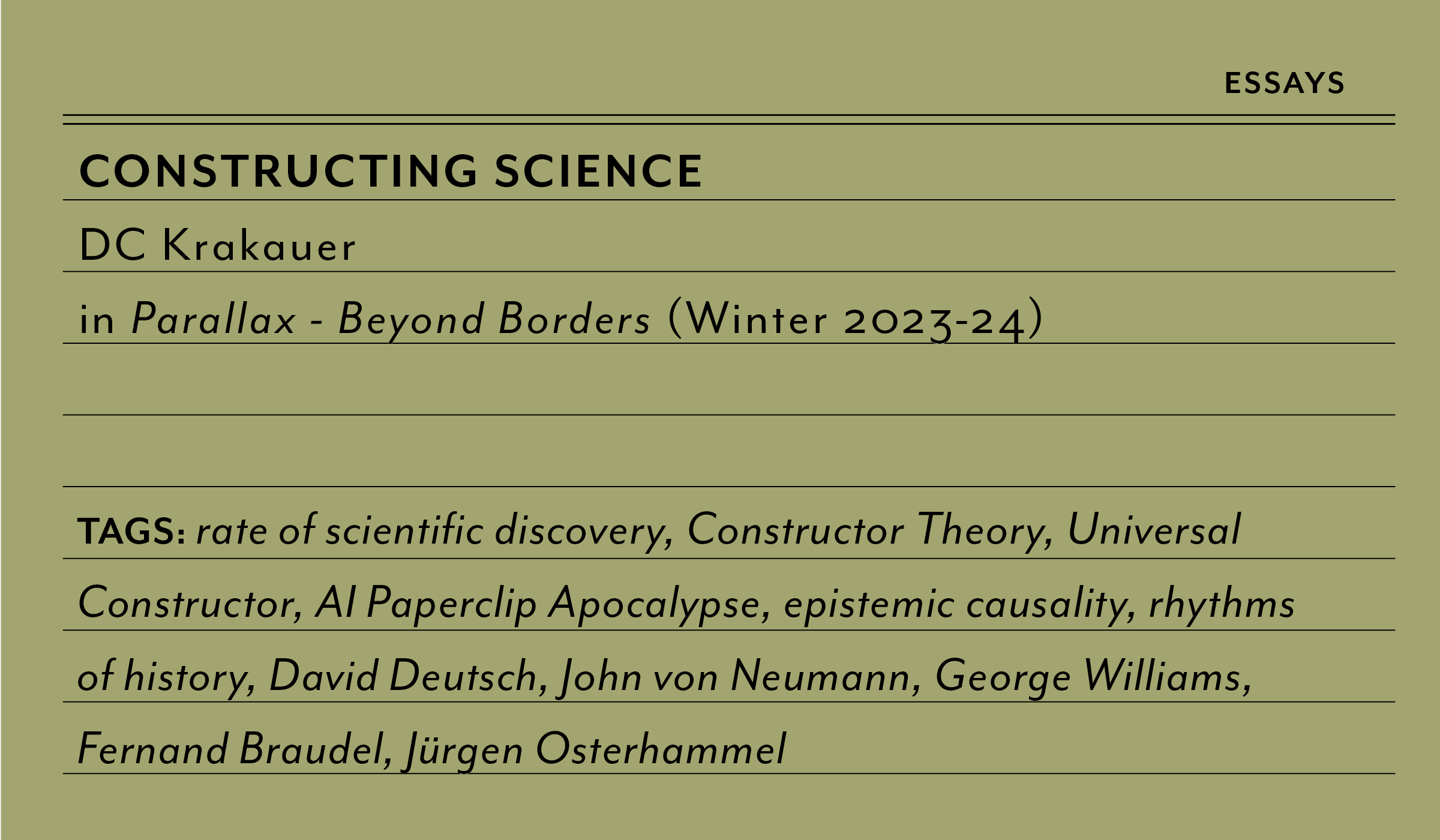 2024 Constructing Science essaysessays & reviews Jan 30 Written By David C. Krakauer Click on card to view essay. rate of scientific discoveryConstructor TheoryUniversal ConstructorAI Paperclip Apocalypseepistemic causalityrhythms of historyDavid DeutschJohn von NeumannGeorge WilliamsFernand BraudelJürgen Osterhammel David C. Krakauer