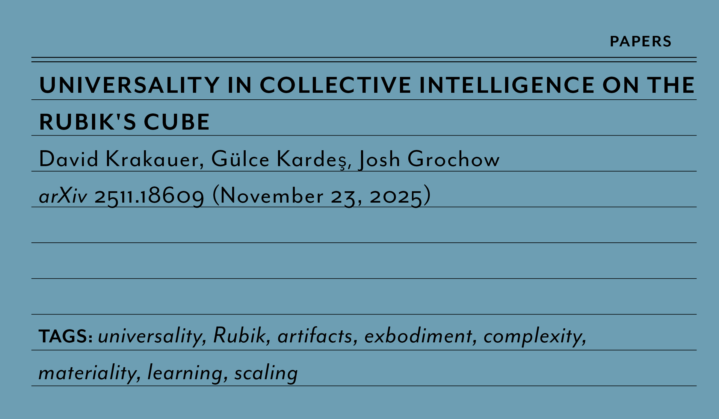 2025 Universality in Collective Intelligence on the Rubik's Cube papers Nov 25 Written By David C. Krakauer universalityRubikartifactsexbodimentcomplexitymaterialitylearningscaling David C. Krakauer